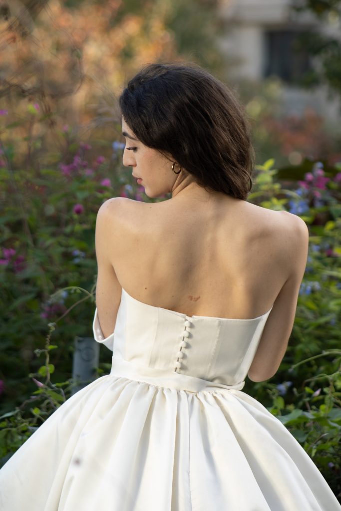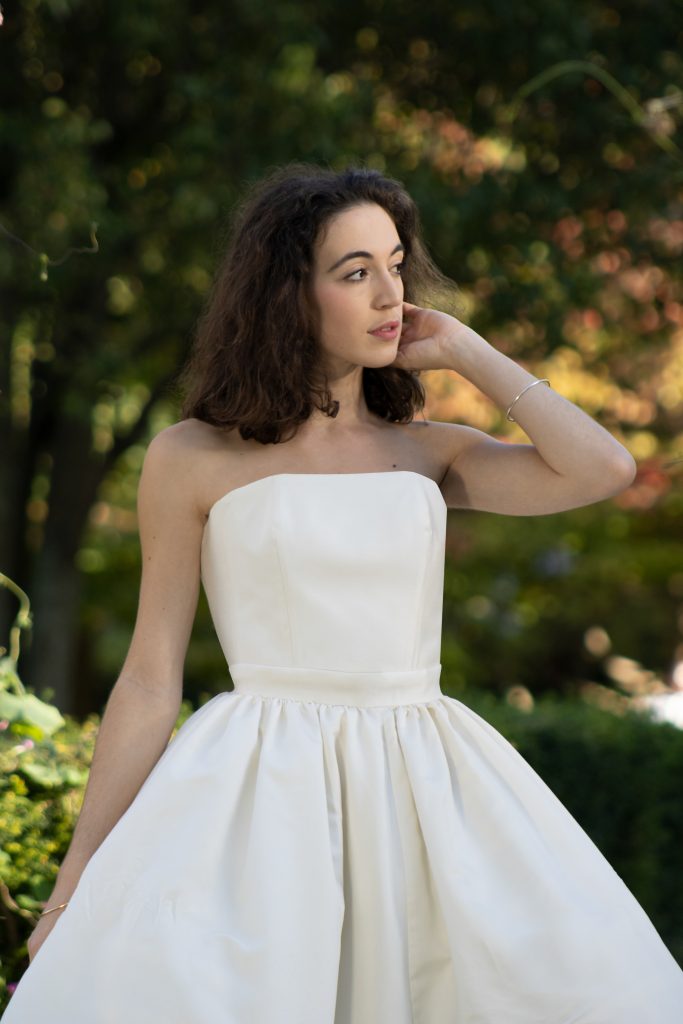 La soie sauvage, choisie pour son tombé et son toucher brut, apportait une authenticité subtile et soulignait la carnation lumineuse de Pauline. De fines fronces à la taille venaient accentuer la grâce du mouvement, tandis qu’une simple paire de longs gants blancs complétait la tenue d’une touche de pureté classique.